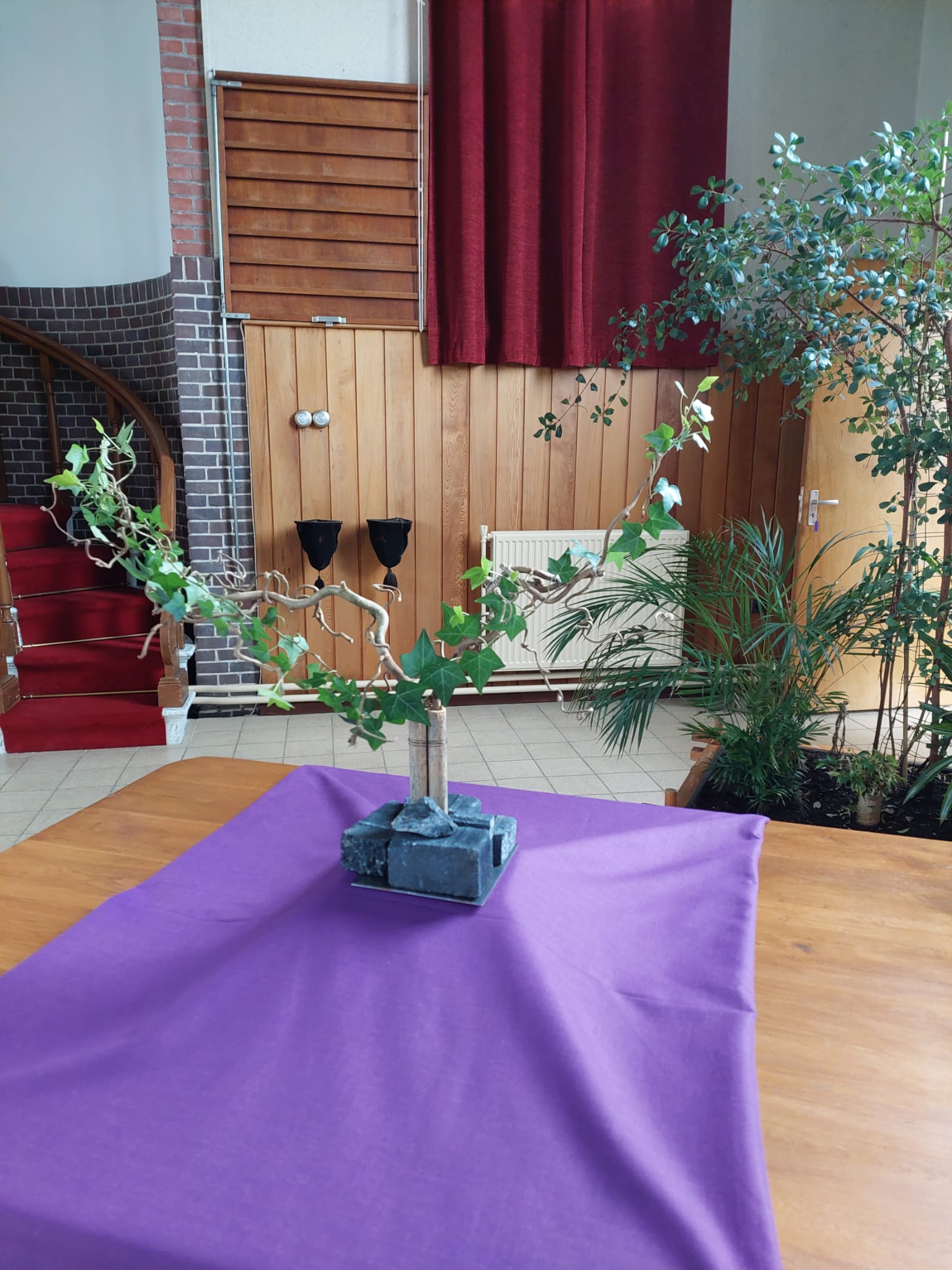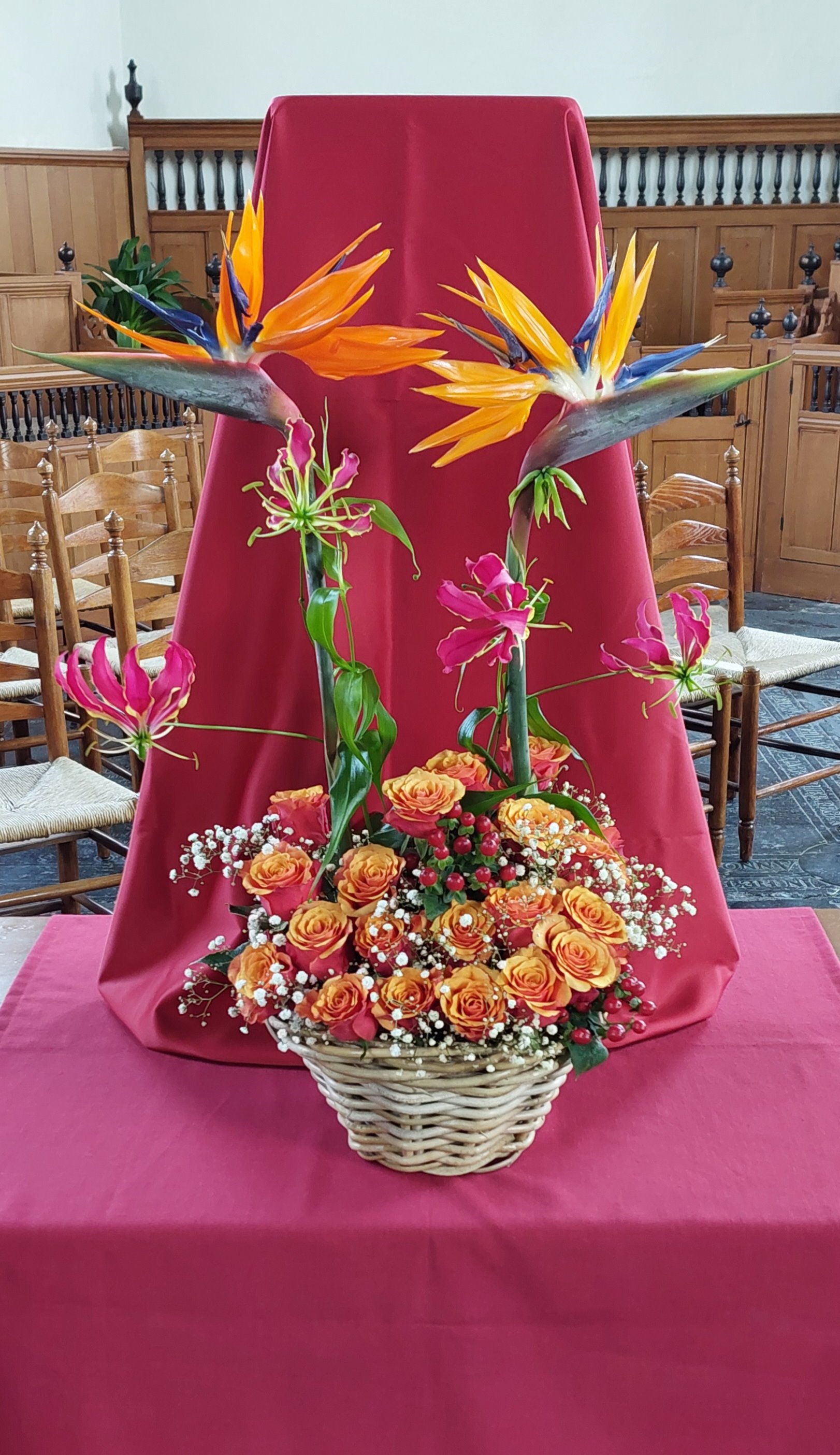 Een mooi boeket bloemen brengt schoonheid in de kerk, maar een symbolische bloemschikking kan ook ons hart raken. We vieren dat door de kracht van Gods Geest het evangelie de wereld over ging en toegankelijk werd in alle talen. Samen met de prachtige bloemen in allerlei kleuren staat de groen bemoste boog symbool voor de HOOP, die vol is van verwachting voor de toekomst. Boven de 3 blauwe Lisianthus bloemen ziet u de 3 Eremuris bloemen met aan de weerszijden een Stralizia ( papegaaibloem). Gedichtje, |